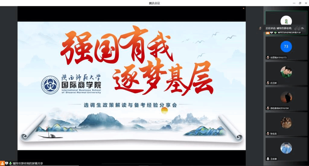 首先,吴乐从选调生的定义与国家选调生工作的关键节点出发介绍了选调生的“前世今生”。随后,吴乐围绕着选调生的分类、报考的资格条件、选调生录取比例、选调生的优势和待遇、选调生与公务员的区别等内容深入分析,建议同学们结合自身条件积极报考选调生。最后,吴乐向同学们详细介绍了考试时间、考试内容、2021年陕西省内笔试情况等内容,建议同学们尽早确定目标,积极备考。紧接着,张媚从三个方面介绍了选调生的相关内容,包括对选调生的认识、选调生基本政策、选调生考试的重点方法梳理。她鼓励同学们要及时关注国家政策、善于整合资源、多做前期准备,做到目标笃定、坚持不懈、执着努力。