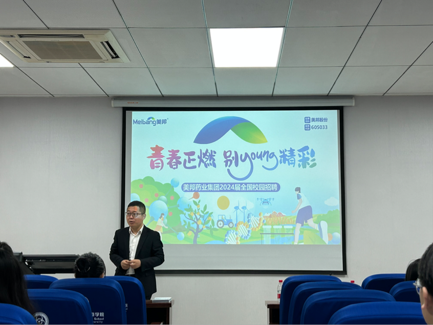 近日公司诚邀全国知名上市企业---陕西美邦药业在文澜楼1331报告厅成功举办了2024年春季就业招聘专场宣讲会,公司部分毕业年级研究生、本科生参加了此次宣讲会。
