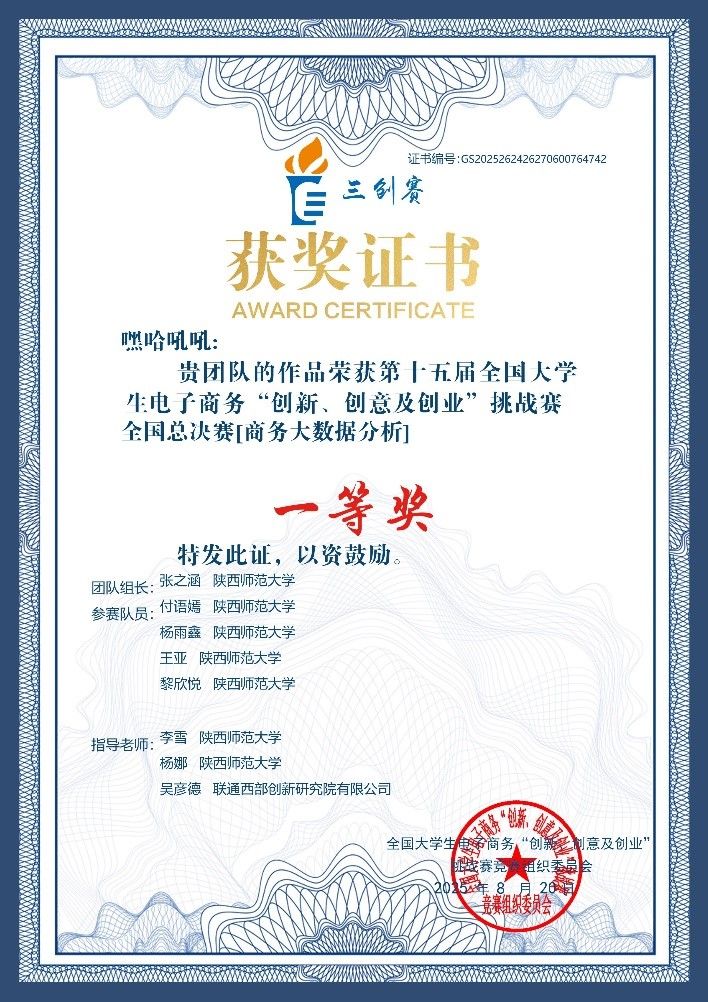 此次斩获全国一等奖,不仅是对嘿哈吼吼队全体成员辛勤付出的肯定,更是公司将创新创业教育和专业教育深度融合取得良好成果的体现,也是商公司在该比赛上的又一突破。未来,公司将继续深化创新创业教育改革,为员工搭建更多实践平台,助力培养更多具备创新精神与创业能力的人才。公司也将以此次成绩为契机,进一步深化学科交叉融合,推动创新创业教育与专业教学深度结合,培养更多兼具家国情怀与创新能力的高素质人才,为服务国家数字经济发展与西部振兴战略贡献师大力量。